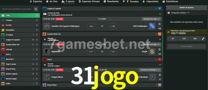 O 31jogo oferece uma grande seleção de opções de apostas em e-sports com probabilidades competitivas